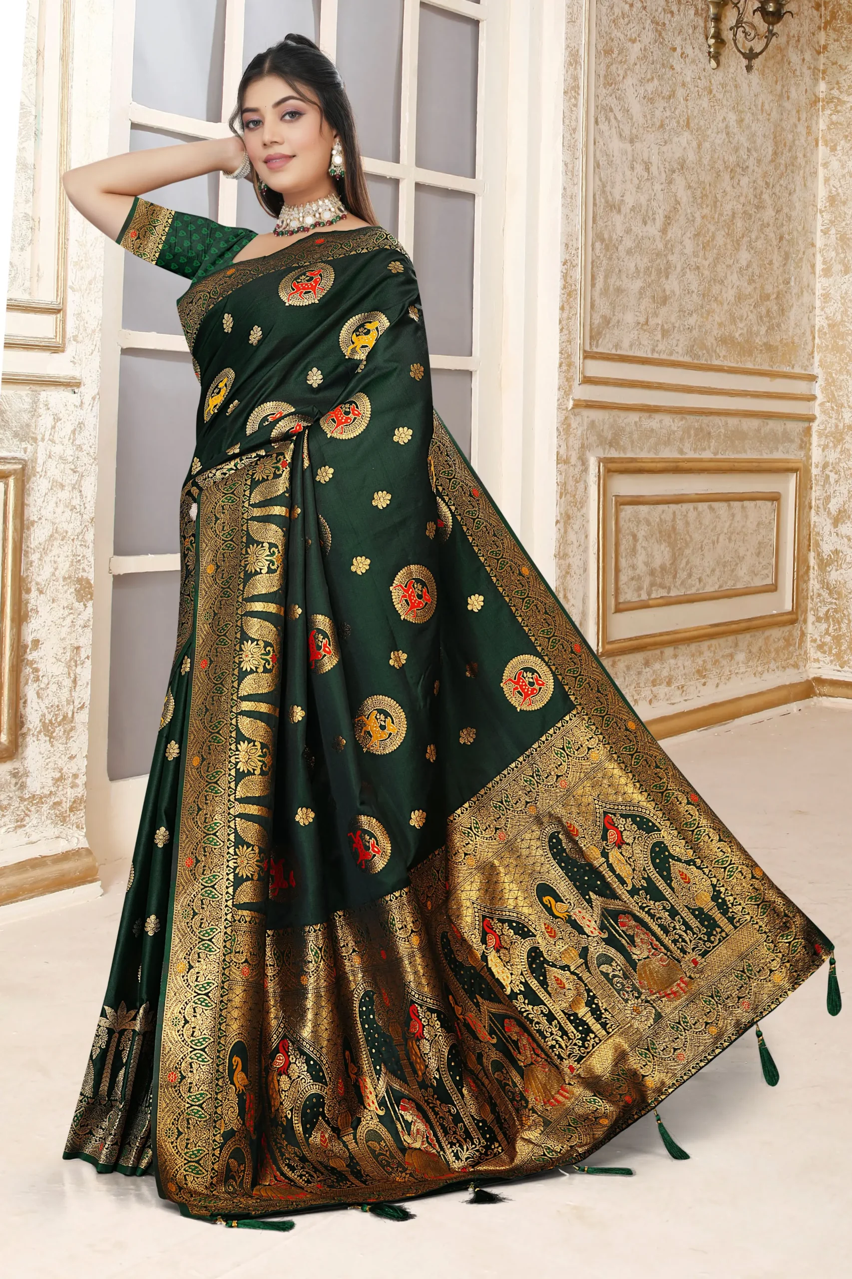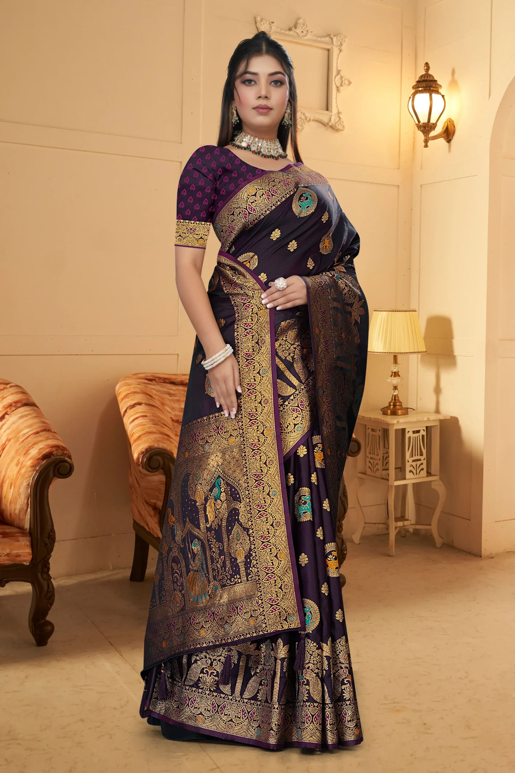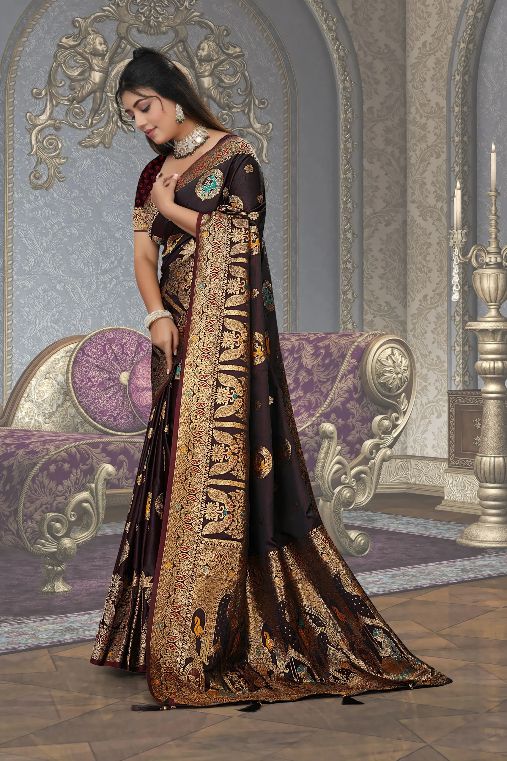 Crafted from a premium satin silk blend, this saree features a stunning, heavy gold zari border that enhances its royal appearance. The rich designer pallu adds traditional charm, making it an ideal choice for weddings, festivals, and grand celebrations.
