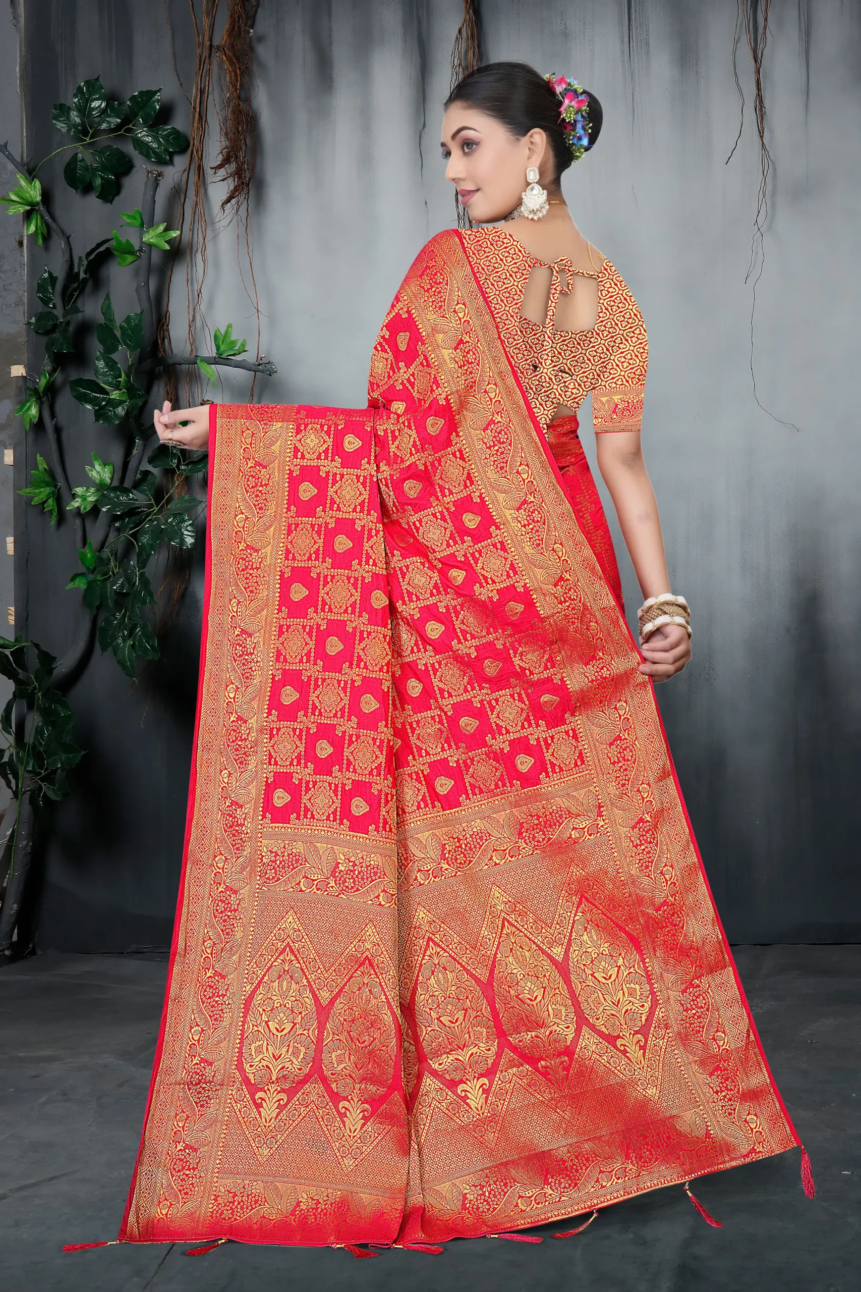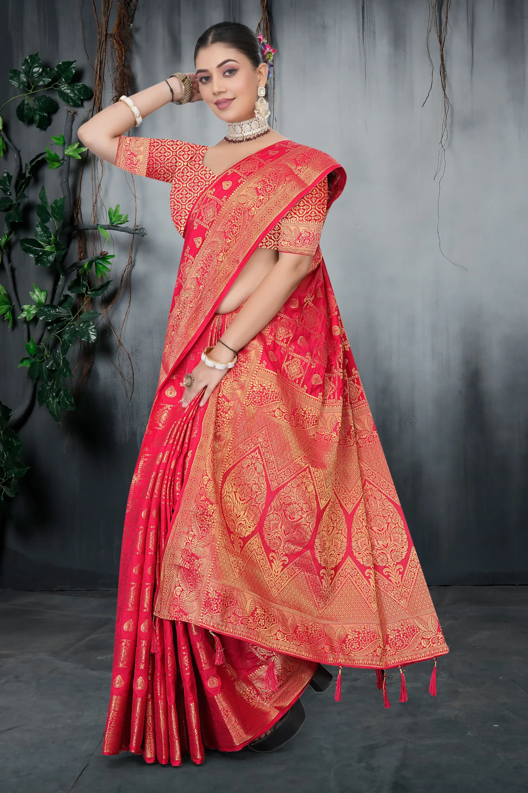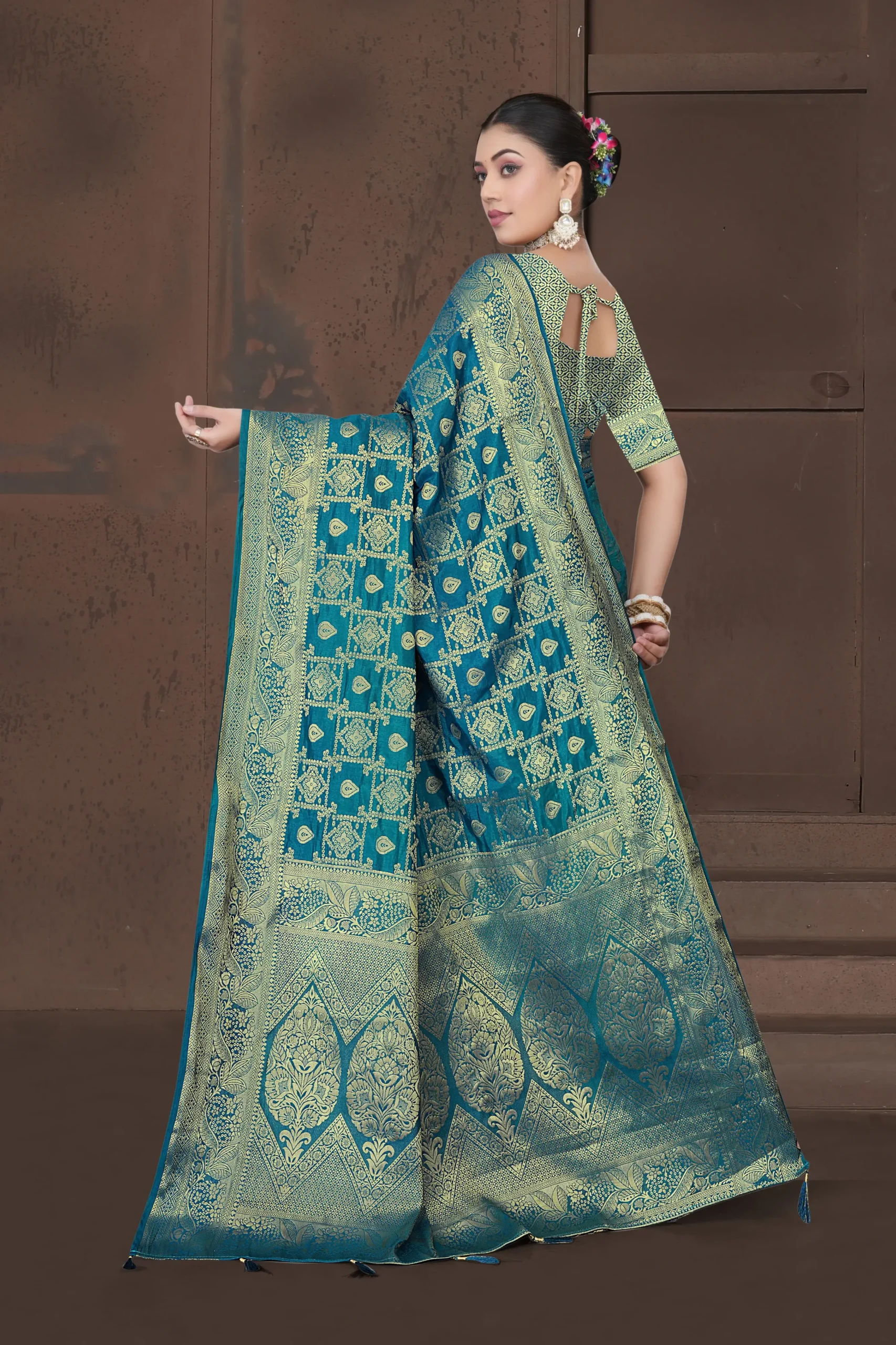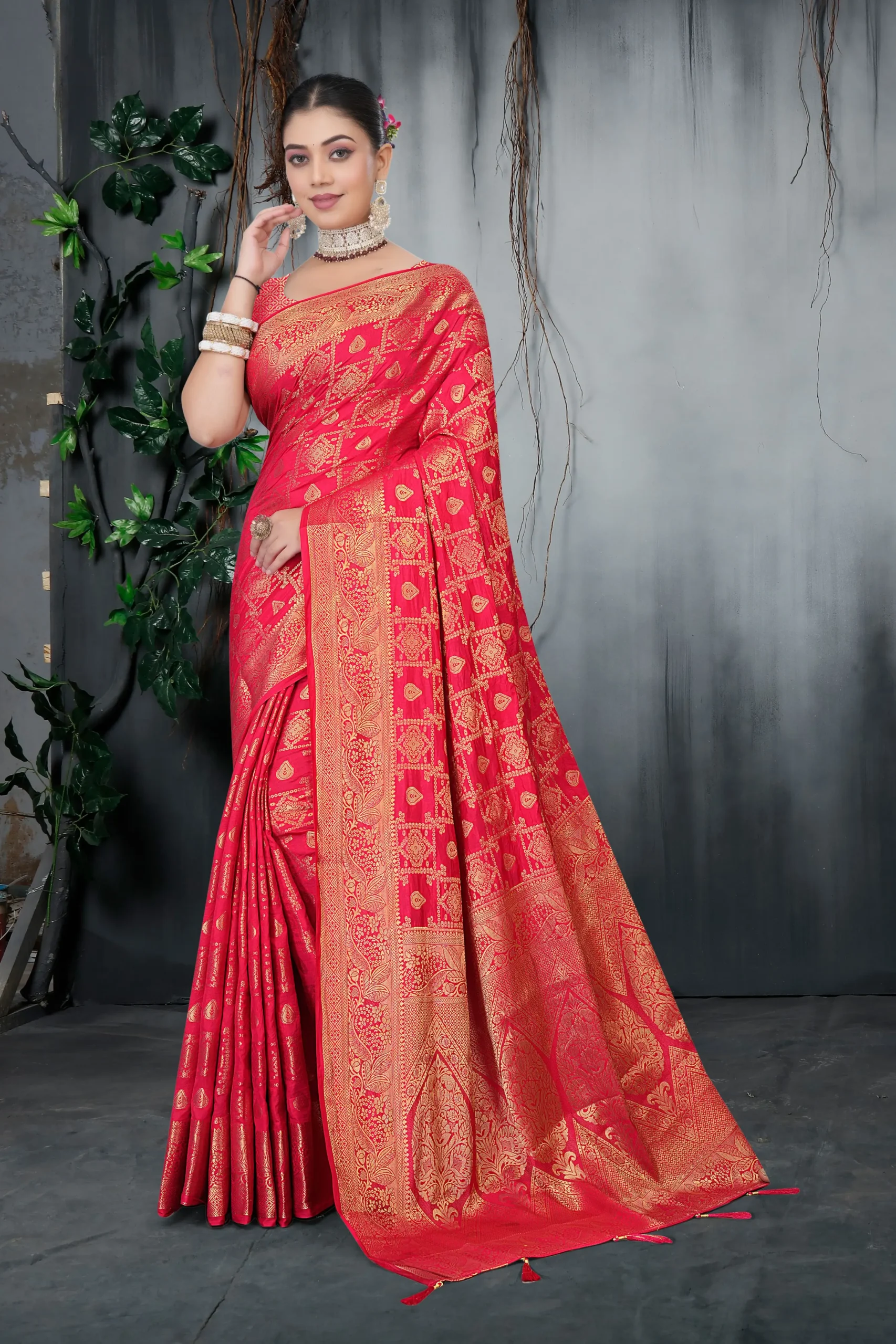 This zari woven dola silk saree is designed to make you stand out effortlessly, whether at weddings, parties, or cultural events.
