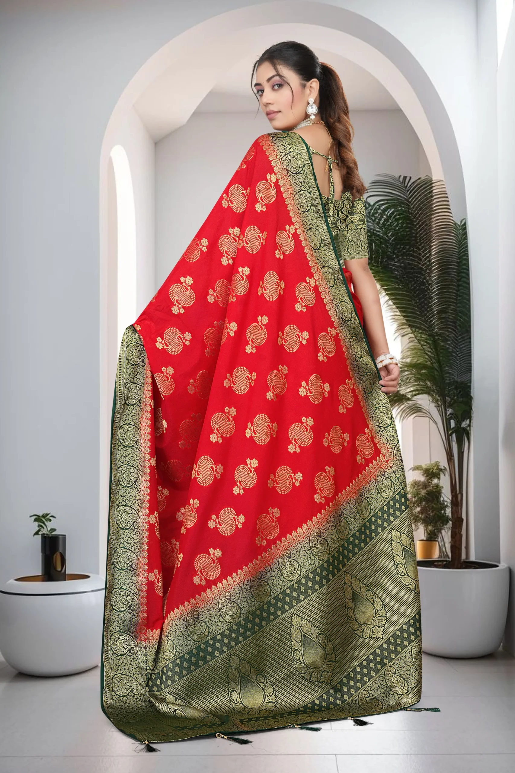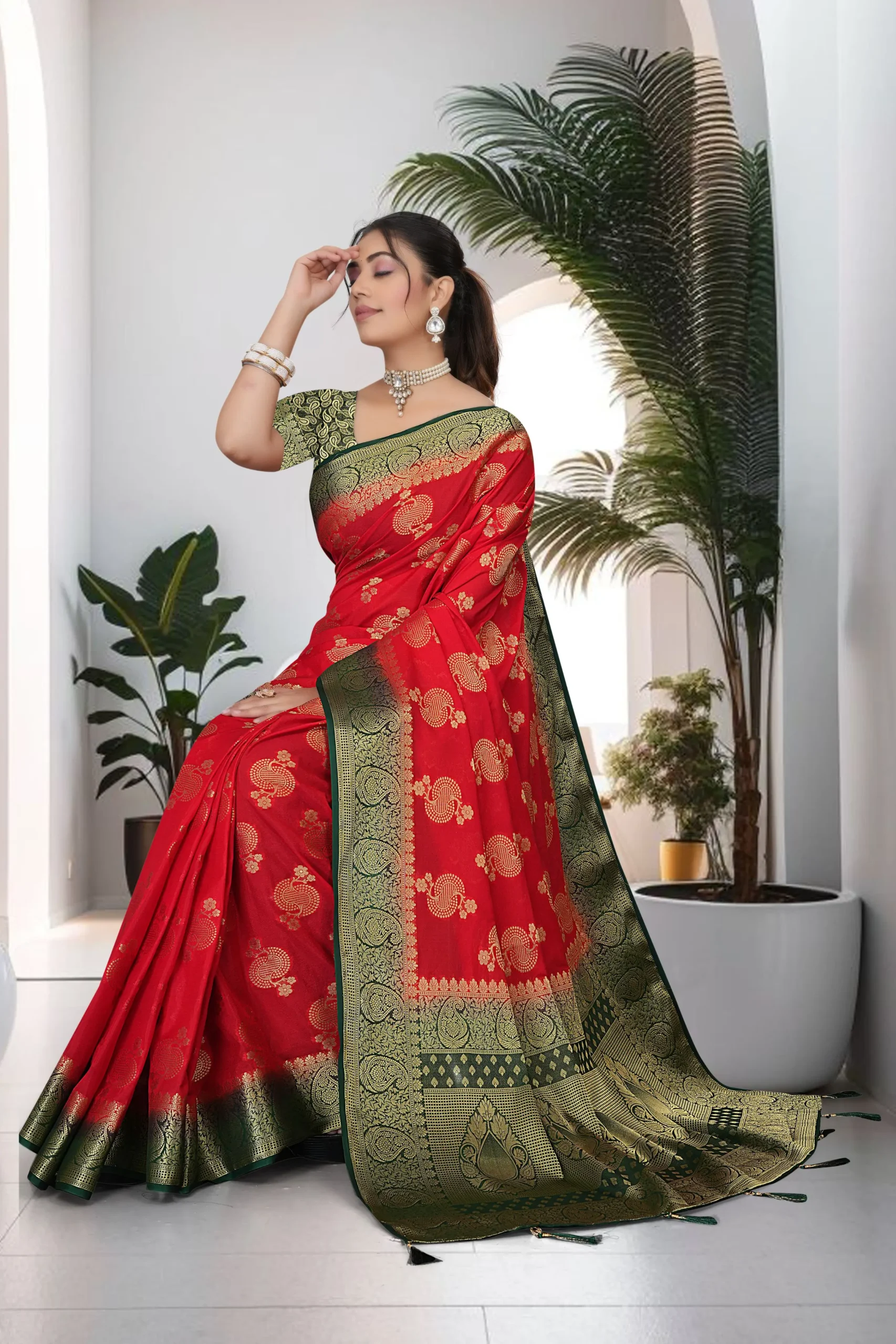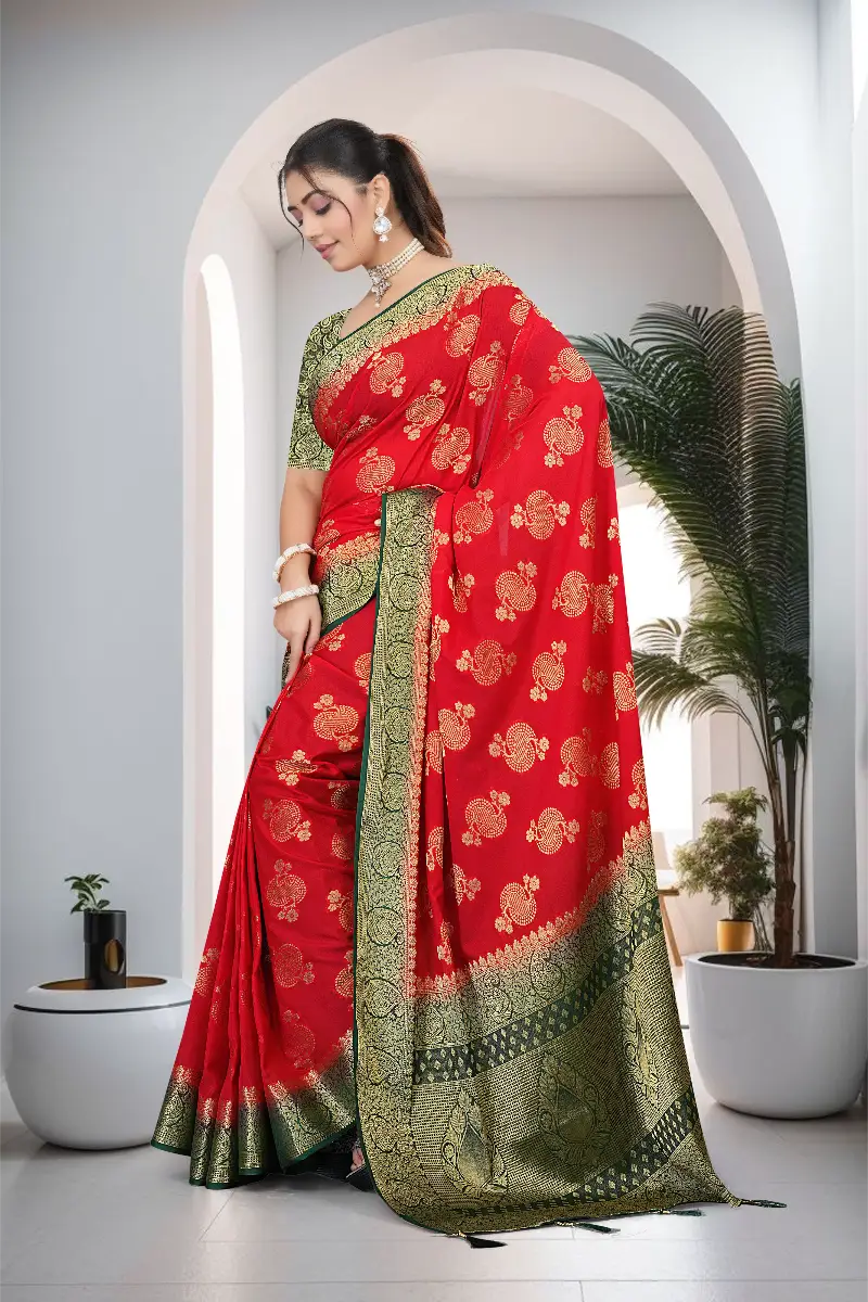 Make a stunning statement with this red crepe saree with green zari border, crafted to bring out timeless elegance and modern charm. The vibrant red color combined with a rich green zari border creates a perfect festive contrast, while the detailed pallu adds a graceful finish.