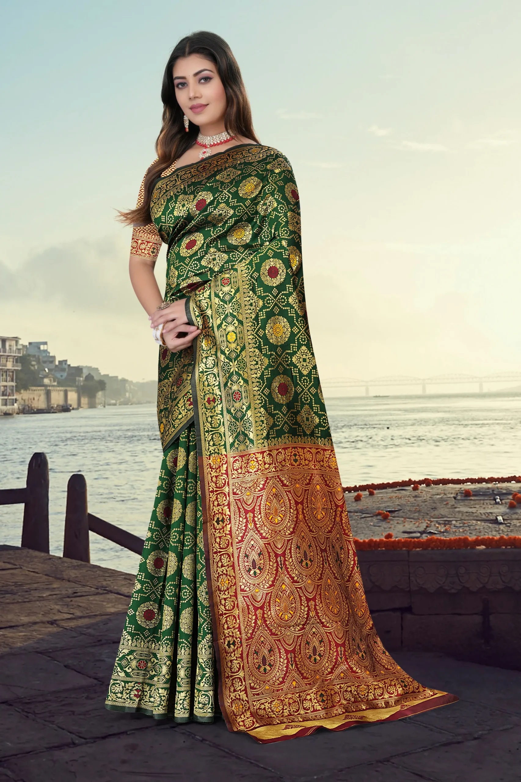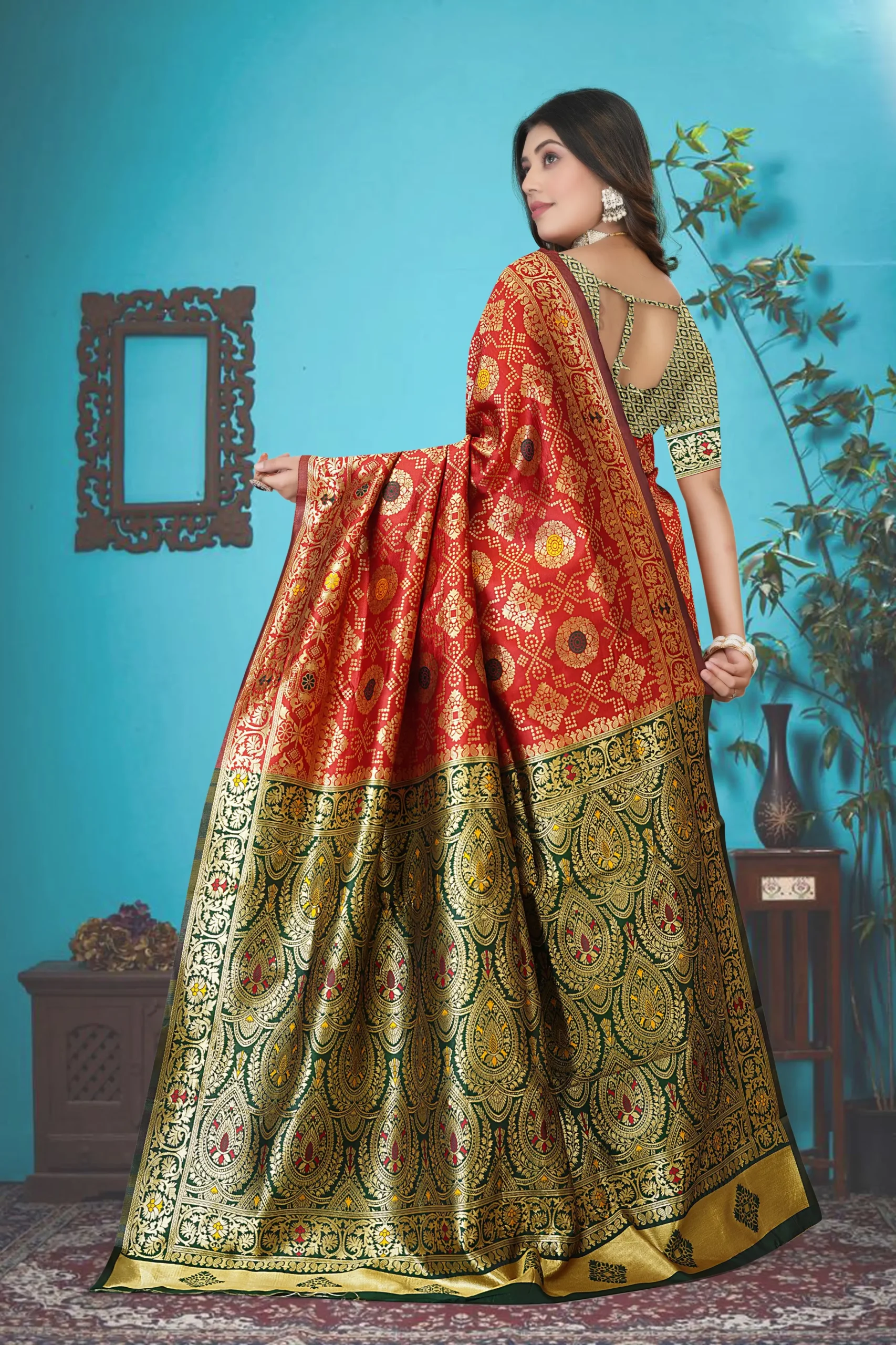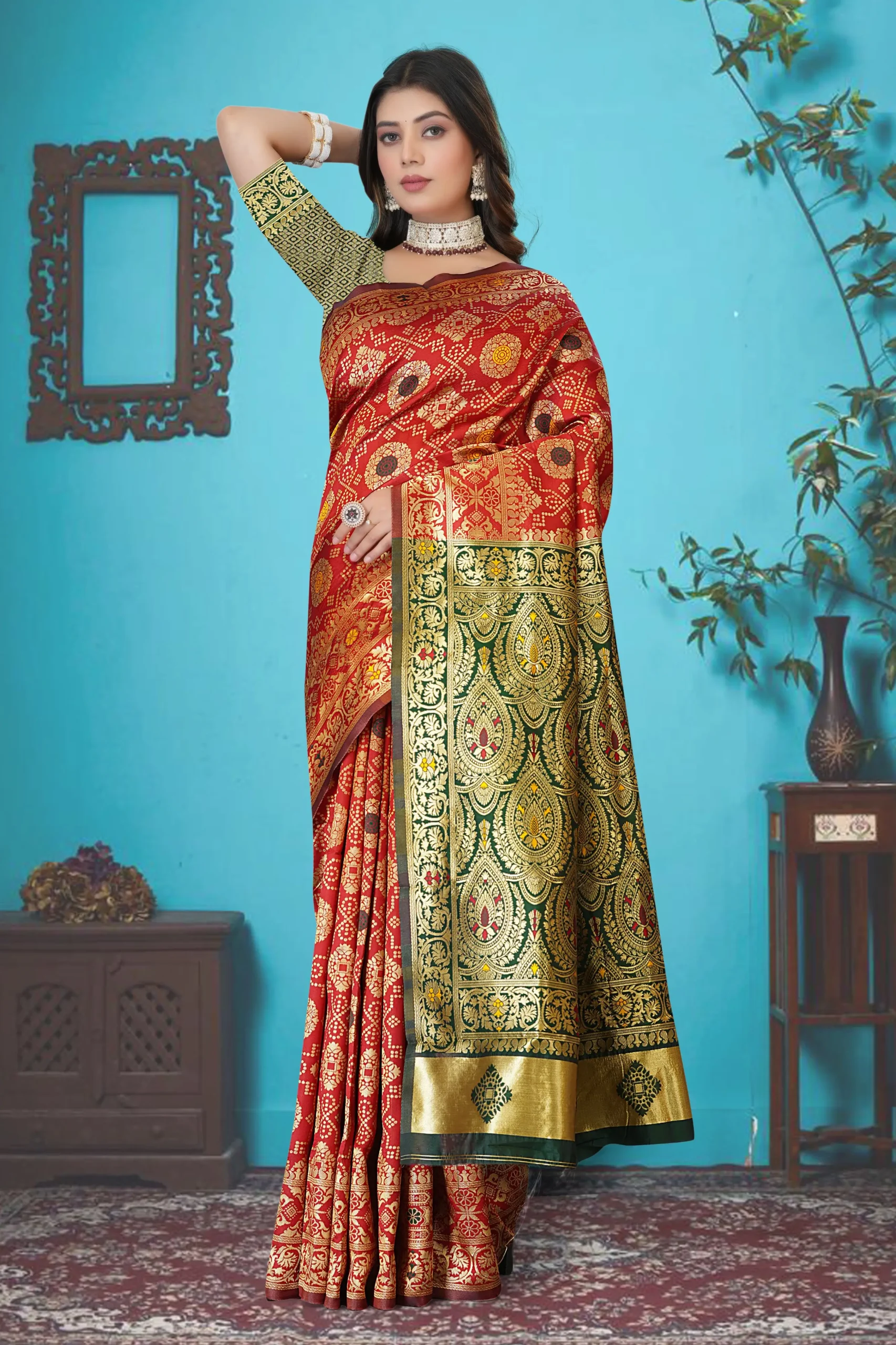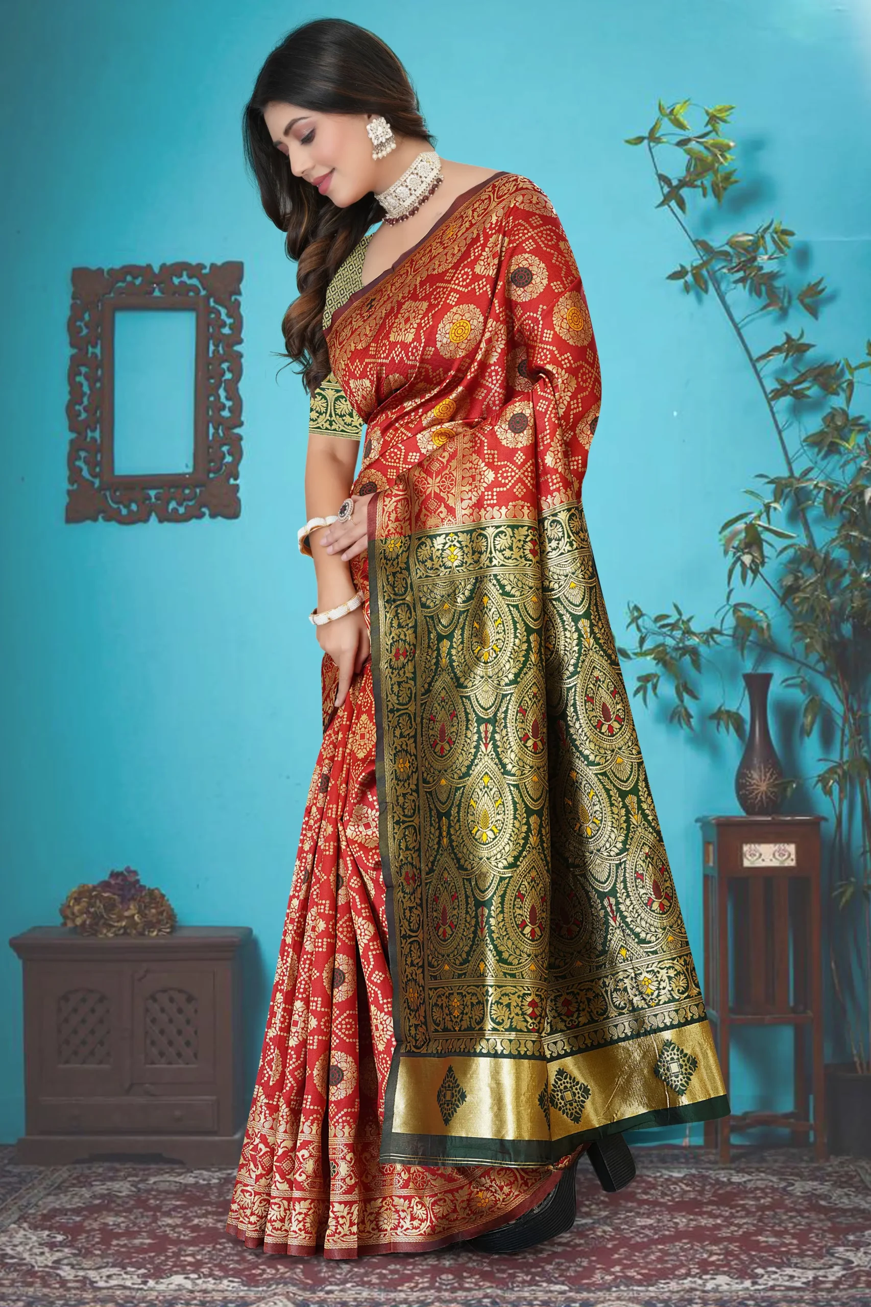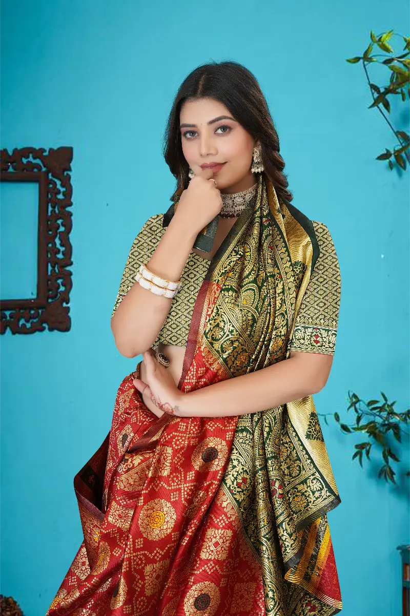 This saree features a rich combination of red and green tones, symbolizing tradition and celebration. The premium silk blend fabric ensures a smooth, comfortable drape while maintaining a luxurious festive appeal.